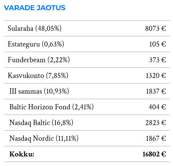 Nagu näha, siis raha osakaal oli alguses päris suur, kui täna on see 6-8% vahel portfellist. Nagu näete, siis Zinzino positsioon oli 1867 €, mis on vahepeal mul portfellis väga suurt kasvu näidanud. Kõik muud positsioonid on läinud peale III samba ja Funderbeami asjade.